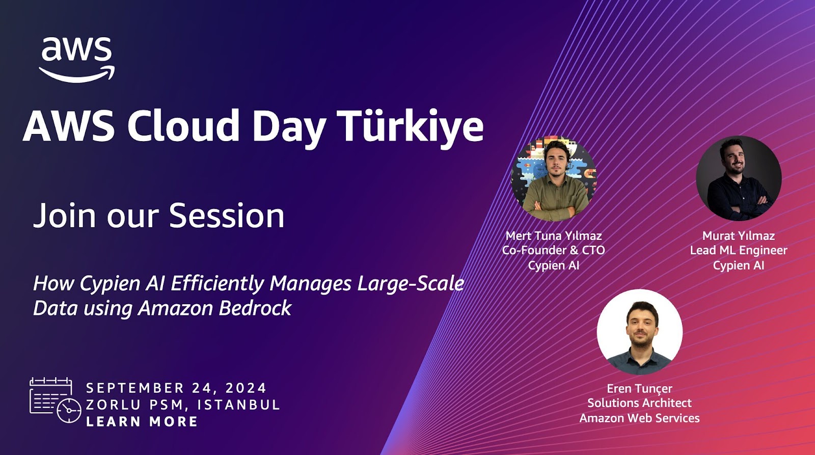 Attending Amazon Cloud Day Türkiye was an incredible experience, bringing together cloud enthusiasts, industry experts, and innovators to explore the latest advancements in AWS technologies. We had the privilege of presenting how Cypien AI efficiently manages large-scale data using Amazon Bedrock, showcasing how leveraging cloud infrastructure enhances performance and scalability in data-intensive environments.
